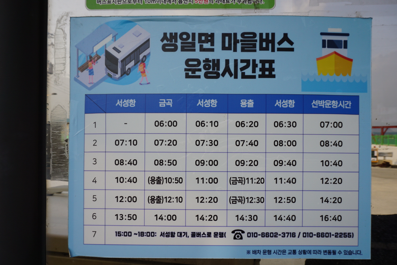 금곡마을 버스 정류장에 붙어있는 마을버스 운행시간표